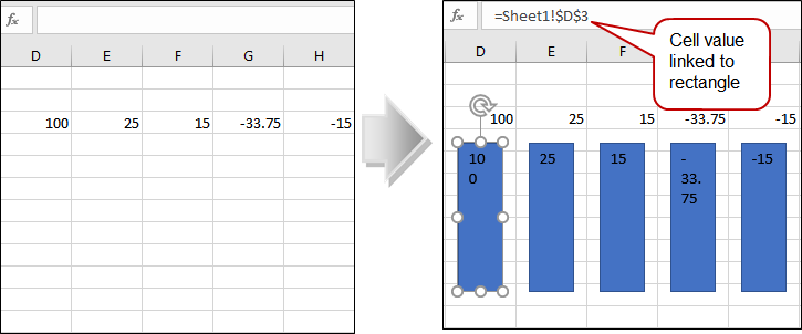 Add Linked Rectangles: Adds rectangles with text linked to the cell values of the selected range. If the range is horizontal, the rectangles will be placed beneath the selected range as below. If the range is vertical, the rectangles are placed to the right of the range. These rectangles can be used to start the Yamataka building process.