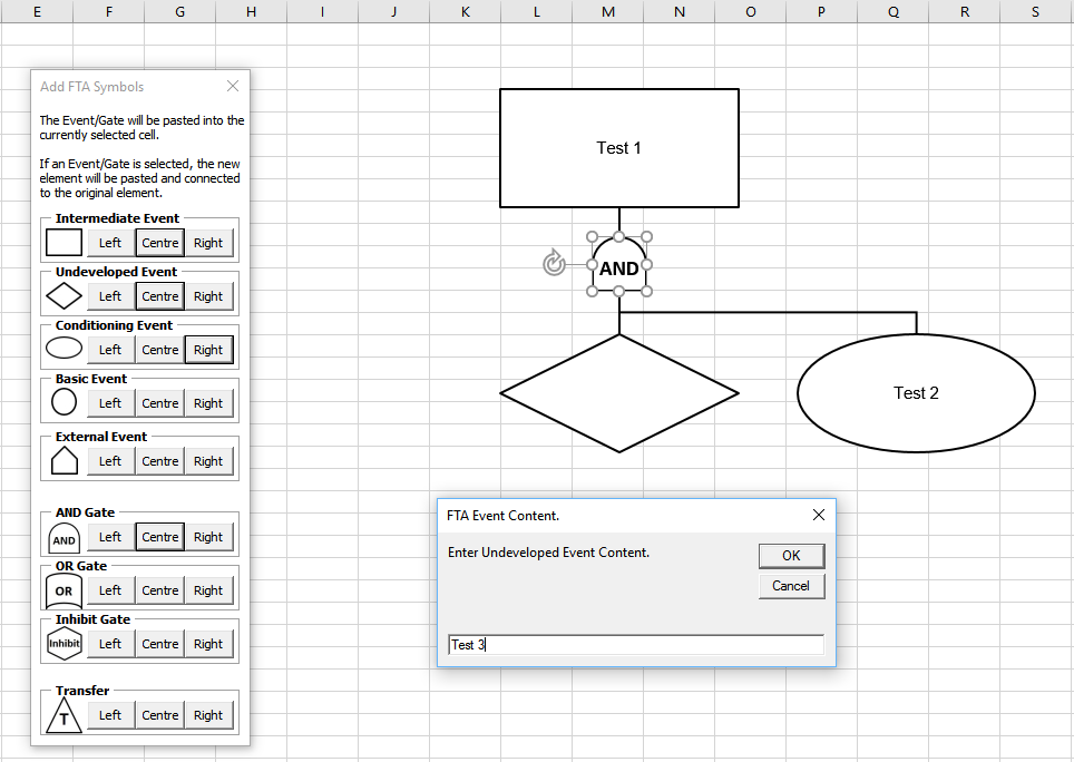 FTA Symbols: Displays a form from which the User can add symbols to build an FTA chart. The Event/Gate will be pasted into the currently selected cell. If an Event/Gate is selected, the new element will be pasted and connected to the original element.