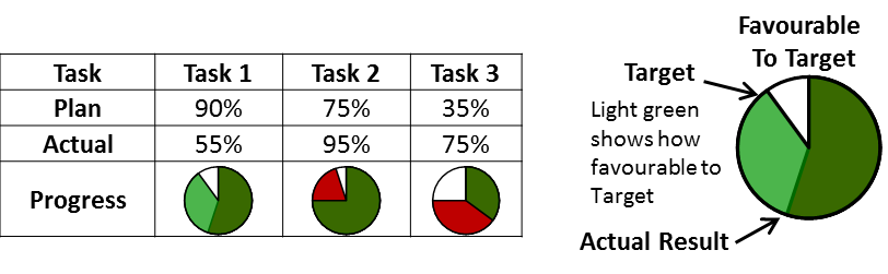 Greater is Favourable: From the selected range of Actuals, returns circular representations of task completion rates based on Plan vs Actual where Actual greater than Plan is favourable. The Progress Pies are pasted to the right or below the selected cells. Targets must be in the adjacent cells above or to the left of the Actuals - both to be entered as percentages.