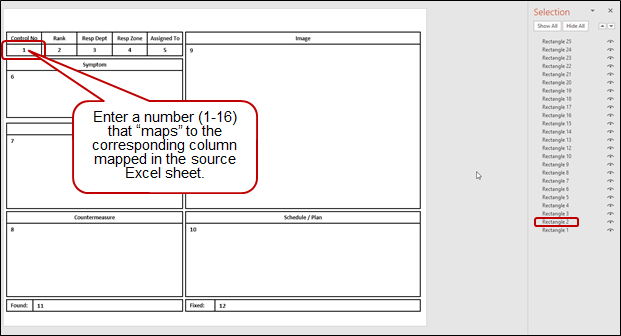 The user can "map" up to 16 fields from Excel to the Slide. The user must identify each shape to be mapped by entering a number between 1-16 as the text value of the shape. Though intended for a single slide presentation, other slides can be included; however, the "mapped" slide must be the first slide in the presentation.