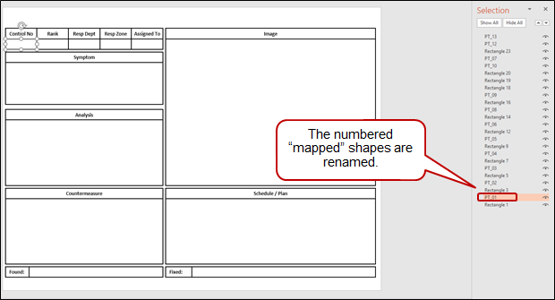 Convert to PTC Template: Based on User input, converts a single slide to work with the EnP Tools Excel macro - Create a Problem Tracking Chart from Template. Essentially, this feature allows the user to convert any single slide presentation into a template that can be populated from any Excel sheet after it has been properly prepared by using the Prep PTC Sheet for PowerPoint Template in Excel. This is particularly useful for standard documents / blank masters.