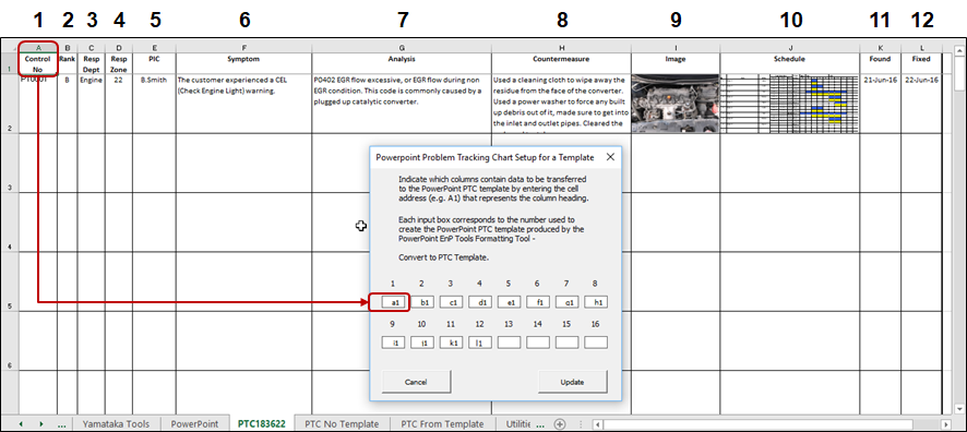 Prep PTC Sheet for PowerPoint: Allows the user to select columns to be exported to a PowerPoint PTC slide. Opens a form to map specific column cells to the PowerPoint Problem Tracking Chart. This allows any worksheet to be used as a source to create a PowerPoint Problem Tracking Chart. The mapped cells are set up as named ranges allowing the text to be modified and the columns rearranged while maintaining the PowerPoint output to remain the same.