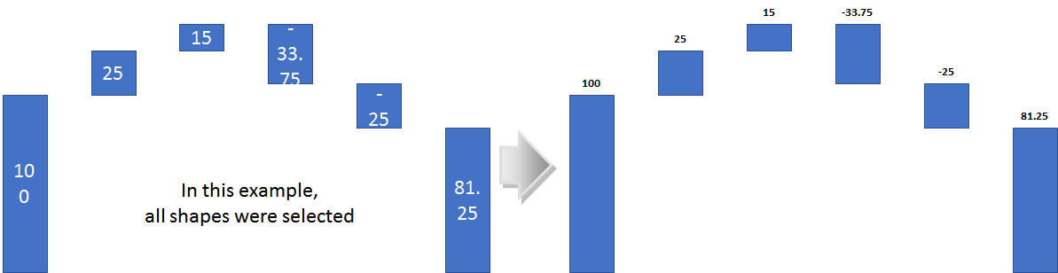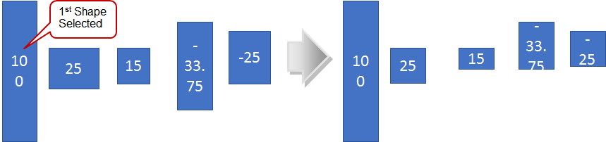 Cascade: Arranges the selected shapes (beginning with the first selected shape) into the basic cascade arrangement of a Yamataka or Waterfall chart. It takes into account whether or not the values in the rectangles are positive or negative and aligns the shapes appropriately. It also horizontally spaces the shapes based on the width of the first shape.