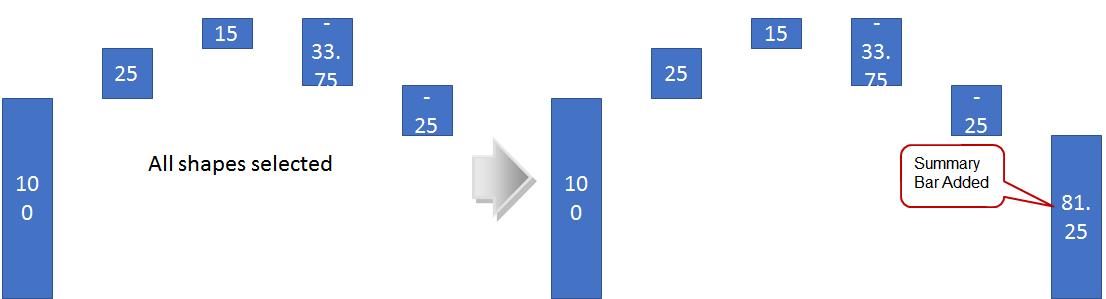 Add Summary Bar: Creates a rectangle with the sum of the values of the selected shapes as it's text value, sets the height and width relative to the 1st selected shape then aligns it's bottom to that shape.